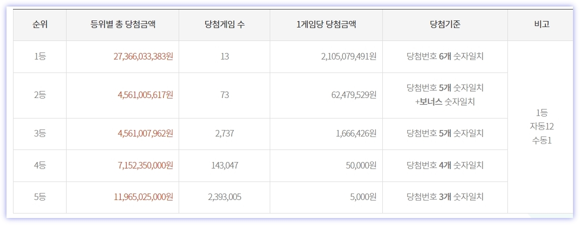 1133회 1등 당첨금은 총 27,366,033,383 입니다. 총 13개의 복권이 당첨이 되었네요. 이번 회차에선 자동 12개, 수동 1개에서 당첨이 나왔는데요! 역시 로또는 자동 구매가 답인가봐요!