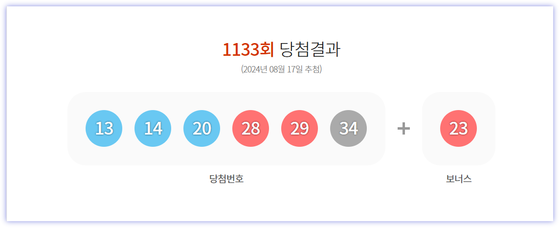 1133회차 로또당첨번호는 13, 14, 20, 28, 29, 34 + 23 입니다. 바로 내 로또 당첨금액을 확인 해 보세요!!