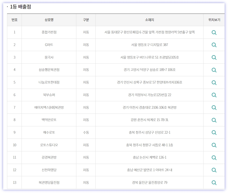 1133회차 1등 배출점은 이러합니다. 서울과 충남, 충북, 경기등 수도권보다 이번엔 지방에서 많이 나온듯 한 기분이네요. 1등 당첨되신 분들 너무나 축하드립니다.